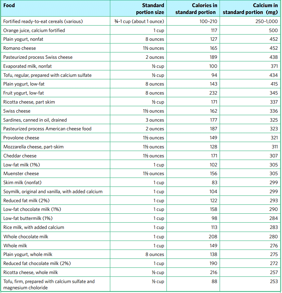 “Milk and milk products contribute substantially to calcium intake by Americans. Calcium recommenda-tions may be achieved by consuming recommended levels of fat-free or low-fat milk and milk products and/or consuming alternative calcium sources. Removing milk and milk products from the diet requires careful replacement with other food sources of calcium, including fortified foods. Calcium in some plant foods is well absorbed, but consuming enough plant foods to achieve the RDA may be unrealistic for many.”